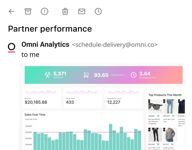 Everyone wants data, but not everyone wants to log into a BI tool to get it. The Omni Platform powers internal reporting, operationalizes data into workflows, and puts dashboards and visualizations directly into your product.